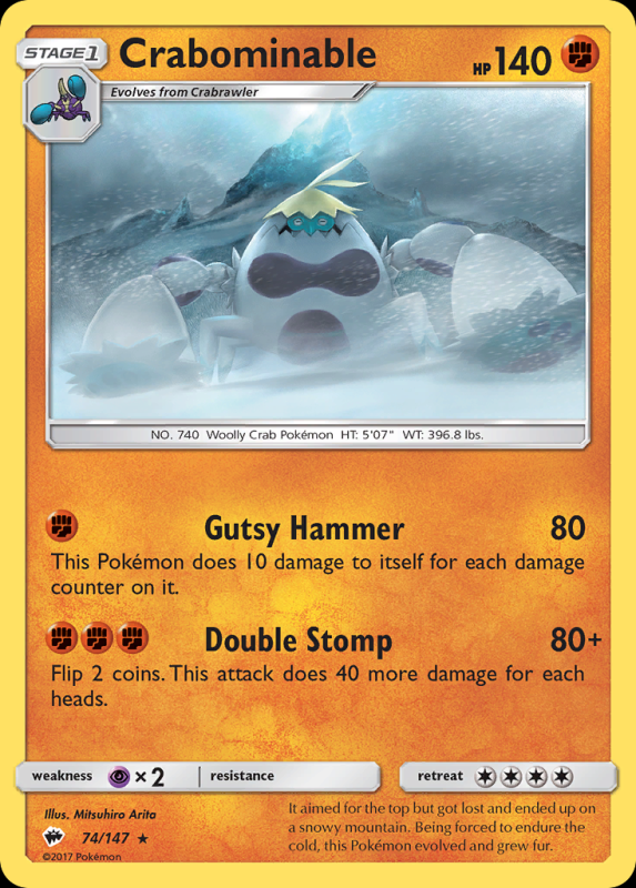 Home / Burning Shadows / sm3Fighting / Crabominable CrabominableR7.50 10 in stock Crabominable quantity Add to basket SKU: sm3-74 Categories: Burning Shadows, sm3Fighting, sm3Pokémon, sm3Rare Description Description FlavorText : It aimed for the top but got lost and ended up on a snowy mountain. Being forced to endure the cold, this Pokémon evolved and grew fur. Related products Riolu (Reverse Holo) R5.00 Add to basket Rhyperior (Reverse Holo) R12.50 Add to basket Scolipede (Reverse Holo) R12.50 Add to basket Sawk (Reverse Holo) R5.00 Add to basket