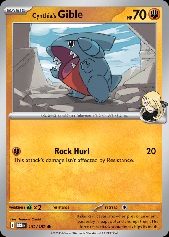 Home / Destined Rivals / Cynthia’s Gible Cynthia’s GibleR3.00 2 in stock Cynthia's Gible quantity Add to basket SKU: sv10-102 Category: Destined Rivals Description Description FlavorText :It skulks in caves, and when prey or an enemy passes by, it leaps out and chomps them. The force of its attack sometimes chips its teeth. Rock Hurl This attack’s damage isn’t affected by Resistance. Related products Electabuzz R3.00 Add to basket Cynthia’s Power Weight (Reverse Holo) R7.50 Add to basket Barraskewda R4.50 Add to basket Dwebble R3.00 Add to basket