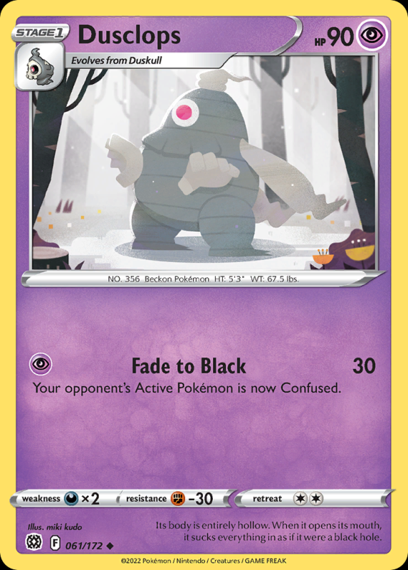 Home / Brilliant Stars / swsh9Pokémon / Dusclops DusclopsR8.00 1 in stock Dusclops quantity Add to basket SKU: swsh9-61 Categories: Brilliant Stars, swsh9Pokémon, swsh9Psychic, swsh9Uncommon Description Description FlavorText : Its body is entirely hollow. When it opens its mouth, it sucks everything in as if it were a black hole. Related products Karrablast R5.00 Add to basket Clefairy R5.00 Add to basket Starmie R8.00 Add to basket Exeggcute R5.00 Add to basket
