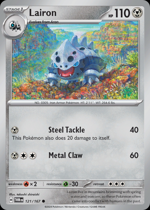 Home / Twilight Masquerade / sv6Common / Lairon LaironR3.00 1 in stock Lairon quantity Add to basket SKU: sv6-121 Categories: sv6Common, sv6Metal, sv6Pokémon, Twilight Masquerade Description Description FlavorText : Lairon live in mountains brimming with spring water and iron ore, so these Pokémon often came into conflict with humans in the past. Related products Ariados R4.50 Add to basket Clefable R4.50 Add to basket Emolga (Reverse Holo) R3.00 Add to basket Abra R3.00 Add to basket
