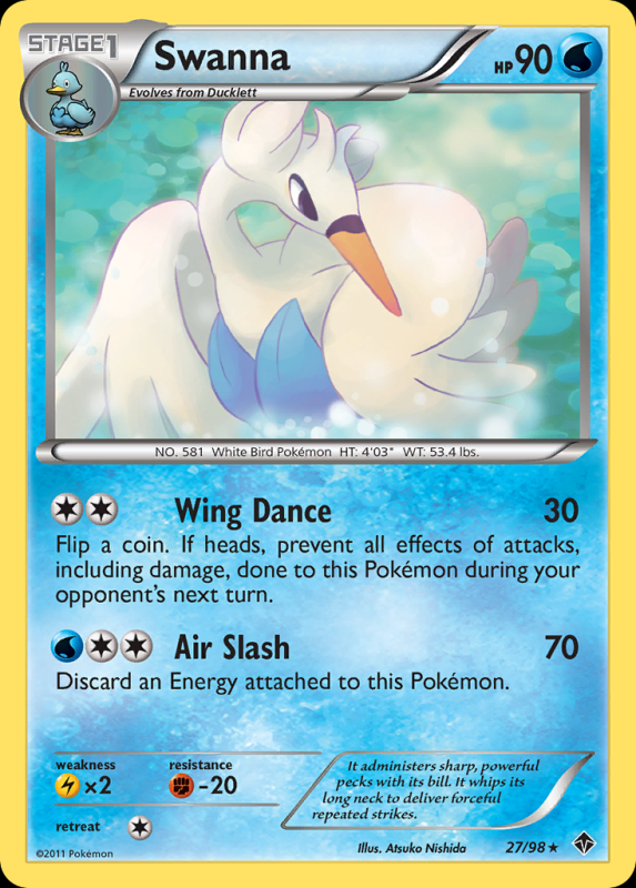 Home / Emerging Powers / bw2Colorless / Swanna SwannaR10.00 2 in stock Swanna quantity Add to basket SKU: bw2-27 Categories: bw2Colorless, bw2Pokémon, bw2Rare, Emerging Powers Description Description FlavorText : It administers sharp, powerful pecks with its bill. It whips its long neck to deliver forceful repeated strikes. Related products Whimsicott R12.50 Add to basket Cottonee R10.00 Add to basket Sewaddle R10.00 Add to basket Joltik R10.00 Add to basket