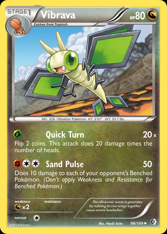 Home / Boundaries Crossed / bw7Grass / Vibrava VibravaR7.50 1 in stock Vibrava quantity Add to basket SKU: bw7-98 Categories: Boundaries Crossed, bw7Grass, bw7Pokémon, bw7Uncommon Description Description FlavorText : The ultrasonic waves it generates by rubbing its two wings together cause severe headaches. Related products Lilligant R10.00 Add to basket Electrode R5.00 Add to basket Marill R10.00 Add to basket Darumaka R10.00 Add to basket